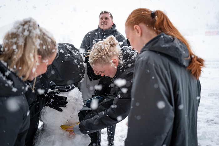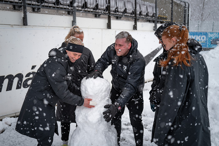 Aðstæður á Kópavogsvelli eru mjög erfiðar, völlurinn er snævi þakinn og það snjóar mikið.