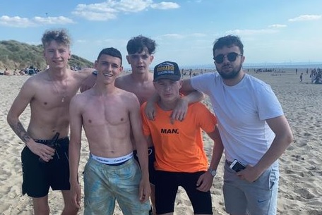 Foden skellti sér á ströndina og lék fótbolta með almenningi. Skorað var á hann í leik og hann var klár í slaginn.