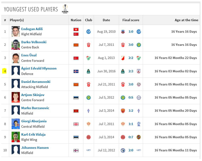Yngsti leikmaðurinn í sögu Evrópudeildarinnar er tyrkneski miðjumaðurinn Endogan Adili en hann var 16 ára og 16 daga þegar hann spilaði með Grasshoppers árið 2010.