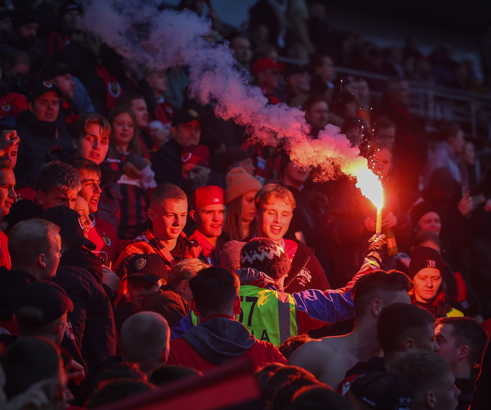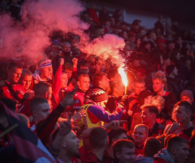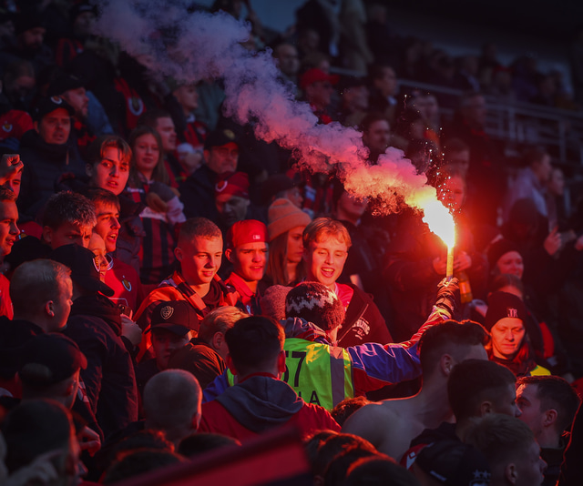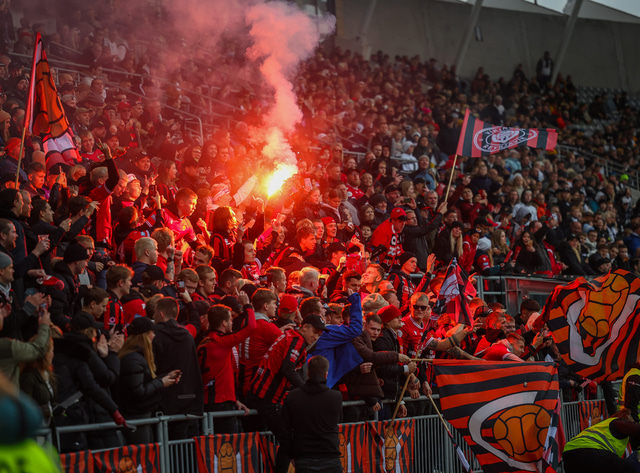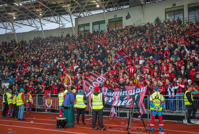 Myndir af því má sjá hér að neðan ásamt fleiri myndum úr stúkunni en stuðningsmenn Víkinga tendruðu óspart blys sem er stranglega bannað á vellinum.