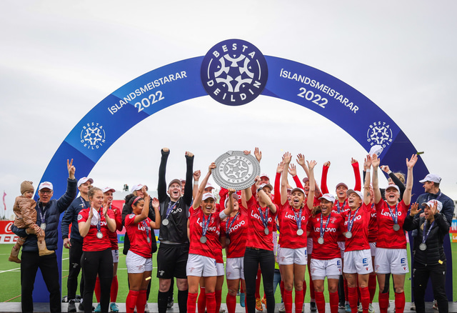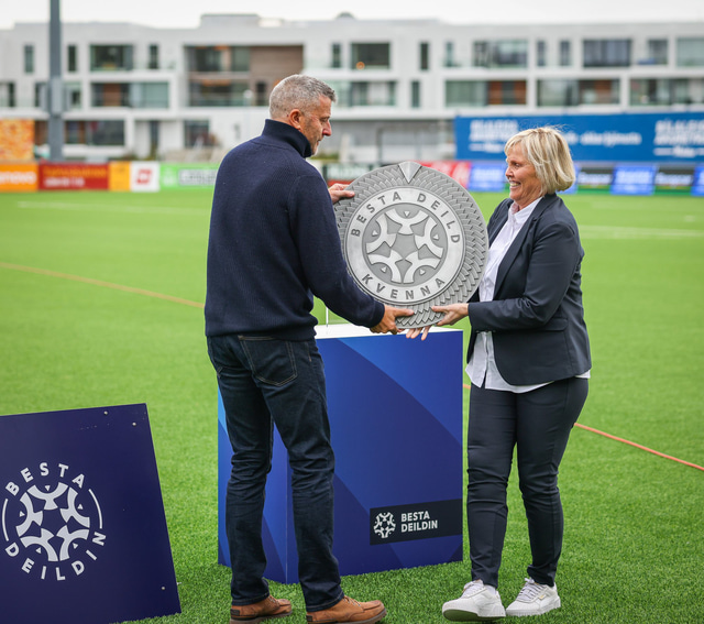 Nýr verðlaunagripur var afhentur fyrir sigur í efstu-deild kvenna í gær en í stað bikars sem hefur verið til þessa er kominn skjöldur.