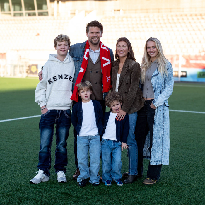 Hermann og fjölskyldan mættu að Hlíðarenda í dag. Á myndinni eru Jóhann Lárus, Hermann sjálfur, Alexandra Fanney eiginkona hans, Thelma Lóa, Hermann Alex og Emil Max. Á myndina vantar elstu dótturina, Ídu Marín, sem leikur með FH í Bestu deildinni.