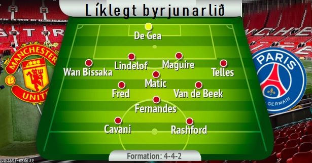 Líklegt byrjunarlið Man Utd: De Gea; Wan-Bissaka, Lindelof, Maguire, Telles; Fred, Matic, Van de Beek; Fernandes, Cavani, Rashford.