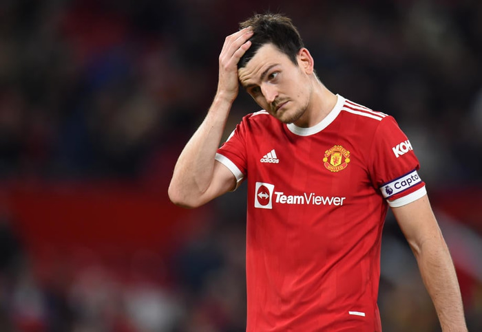 Harry Maguire, fyrirliði Manchester United, var stálheppinn að fá ekki á sig víti undir lok fyrri hálfleiks gegn Arsenal á Old Trafford.