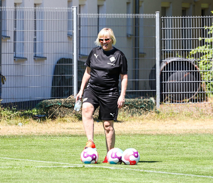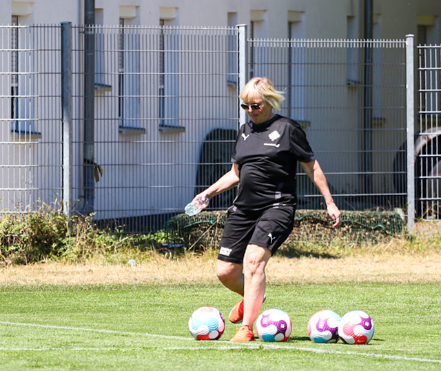Vanda byrjaði æfinguna á því að horfa frá hliðarlínunni, en skömmu síðar var hún farin að hjálpa til. Hún, sem og aðrir starfsmenn KSÍ, sáu til þess að boltarnir fóru ekki of langt í burtu og hjálpaði Vanda við að koma þeim aftur í leik.