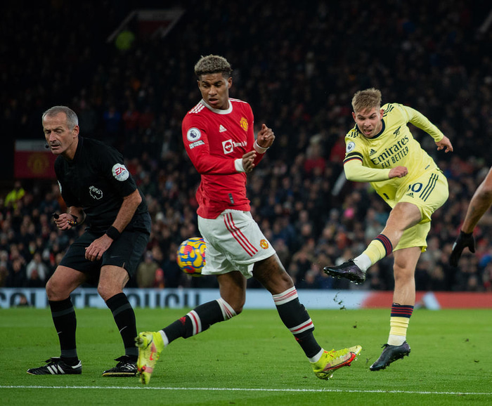 Smith Rowe fékk boltann fyrir utan teig, lét vaða í fyrsta og skoraði í mark Manchester United. Markið má sjá í spilaranum að neðan.