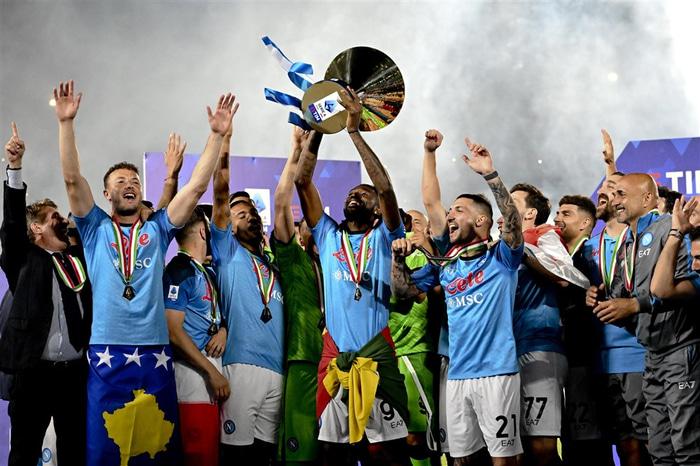 Napoli vann ítölsku Serie A og tók við bikarnum í dag eftir 2-0 sigur liðsins gegn föllnu liði Sampdoria. Victor Osimhen var markahæstur í deildinni en hann skoraði fyrra markið úr vítaspyrnu.