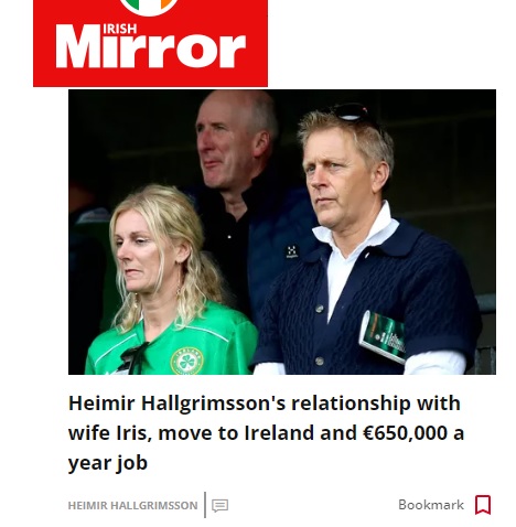 Íris Sæmundsdóttir, eiginkona Heimis, fær einnig nokkra athygli í írskum miðlum en þau hjónin hafa mætt saman á marga leiki á Írlandi eftir að Heimir var ráðinn í starfið. Fjölmiðlar á Bretlandseyjum og Írlandi eru þekktir fyrir að hafa mikinn áhuga á einkalífi og mökum fótboltamanna.