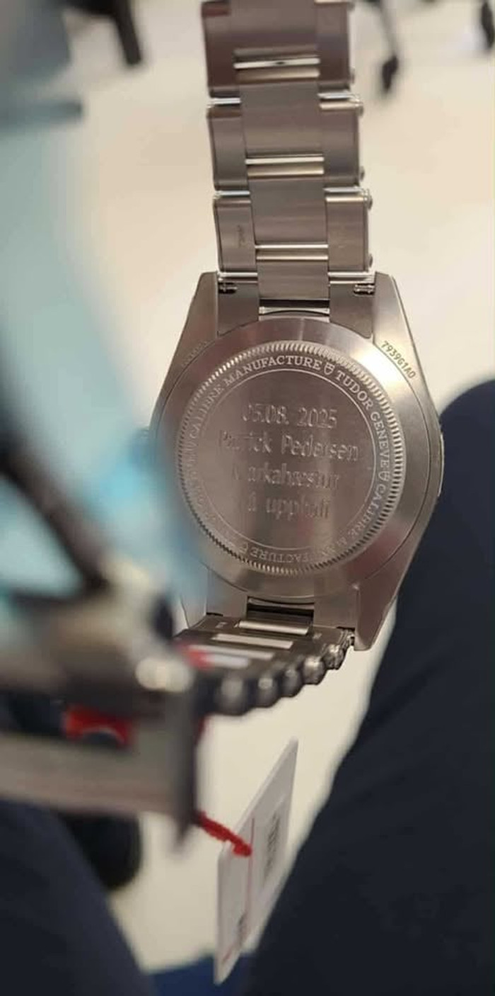 „05.08.2025. Patrick Pedersen. Markahæstur frá upphafi," er áletrað á úrið.