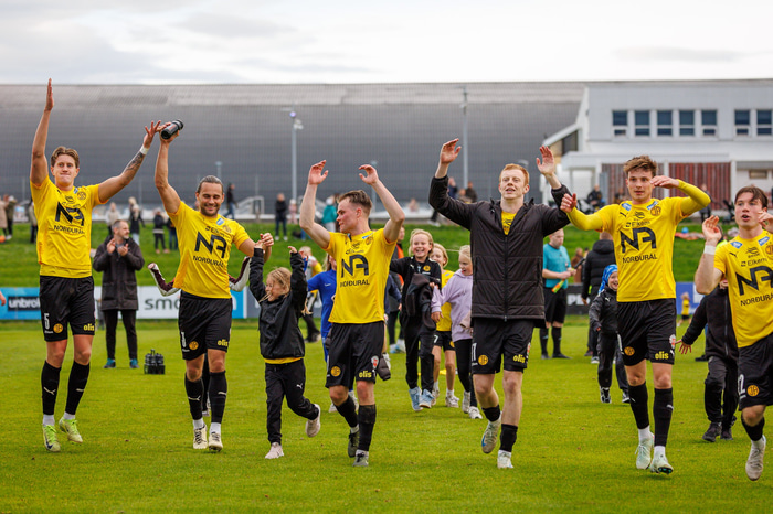 „Þetta er ekki alveg komið en við erum komnir í góða stöðu. Góð spilamennska hélt áfram í dag, strákarnir voru að berjast fyrir hvorn annan og þeir lögðu sig gríðarlega mikið fram. Þeir hafa líka sýnt það í undanförnum leikjum að þeir eru alls ekki slæmir í fótbolta."