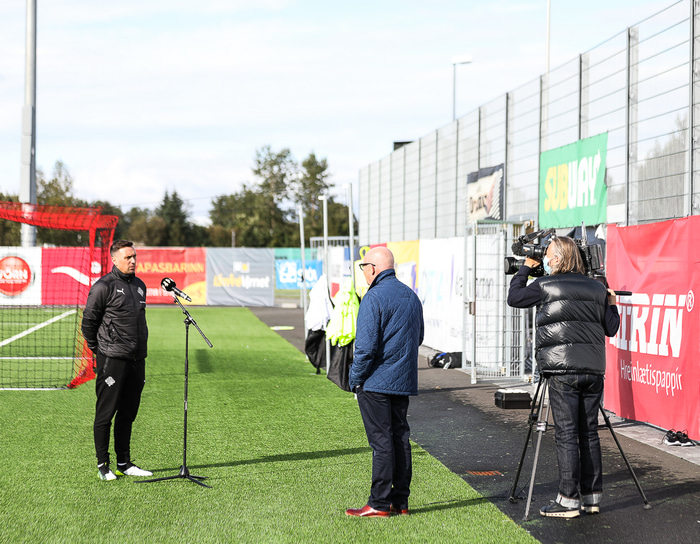„Nú hefur þú og liðið setið undir mikill gagnrýni síðustu mánuði fyrir frammistöðuna. Að sumu leyti er það kannski réttmætt og að sumu leyti kannski ósanngjarnt. Hvað finnst þér sjálfum um þá gagnrýni sem þú hefur fengið í fangið og þann vind sem þú hefur verið með í andlitinu frá því þú tókst við?" spurði Gaupi sem var mættur frá Stöð 2 Sport.