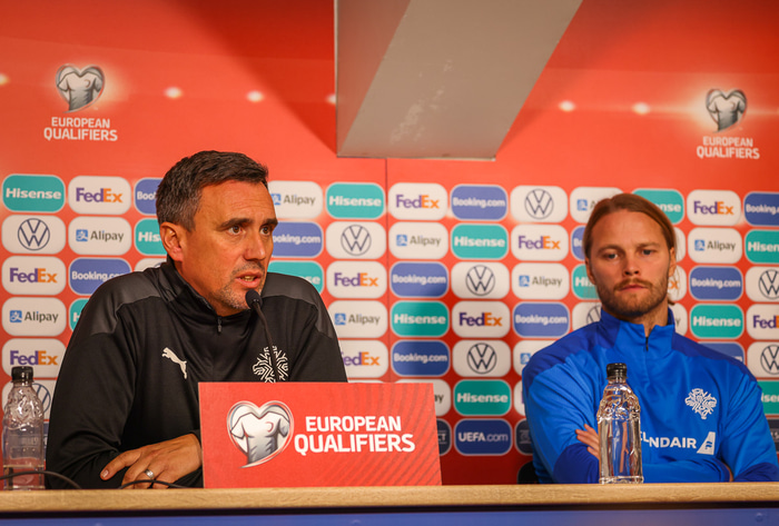 Arnar Þór Viðarsson, landsliðsþjálfari, og Birkir Bjarnason, fyrirliði, sátu fyrir svörum á fréttamannafundi í Laugardalnum í dag fyrir leik karlalandsliðsins gegn Albaníu á morgun.