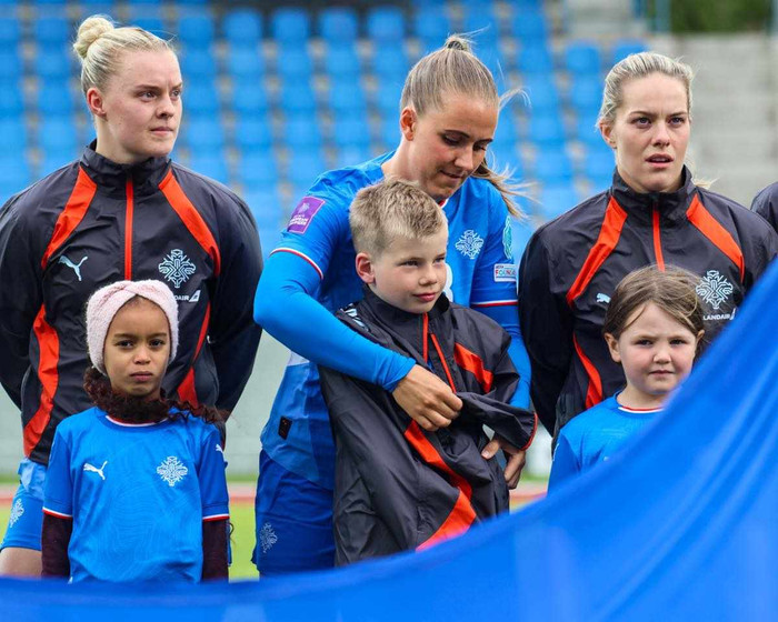 Það vakti athygli þegar þjóðsöngvar Íslands og Austurríkis voru spilaðir að allir leikmenn íslenska liðsins voru í upphitunarpeysum yfir landsliðsbúningnum. Allir nema Guðrún Arnardóttir.