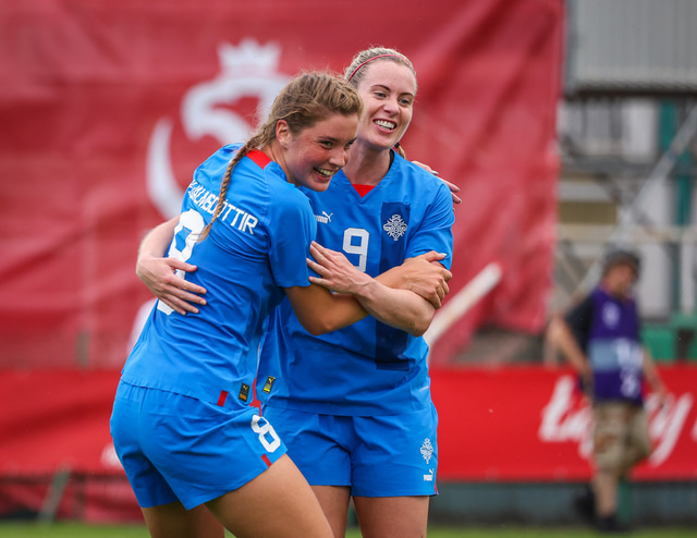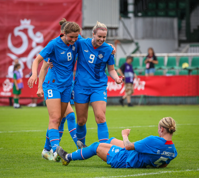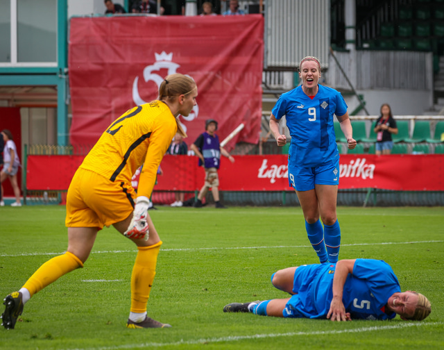 Það er nokkuð gaman að skoða myndirnar sem Hafliði Breiðfjörð tók eftir að markið kom því þá liggur Gunnhildur í jörðinni en leikmenn íslenska liðsins fara beint að henni til að fagna markinu.