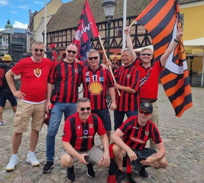 Það er nokkur hópur Víkinga sem er staddur í Malmö og er þegar farinn að lita borgina rauða og svarta.