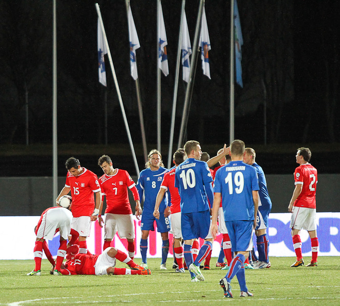Það er þó einnig líklegt að Helgi Valur Daníelsson verði látinn byrja gegn Sviss þar sem skiptir mikilu máli að verjast vel. Kolbeinn Sigþórsson verður fremstur og gæti Gylfi Sigurðsson verið þar fyrir aftan, dregið sig meira til baka svo 4-4-2 leikkerfið verður meira 4-4-1-1.