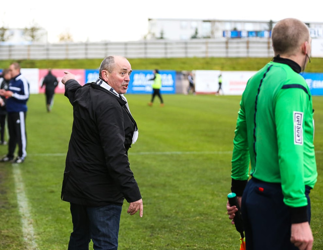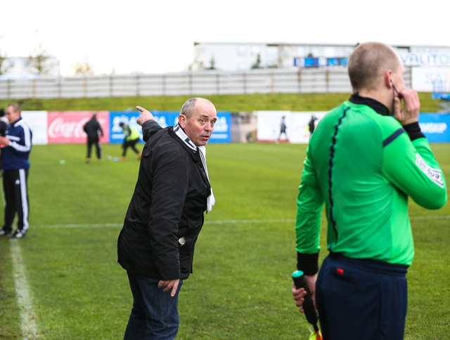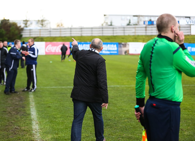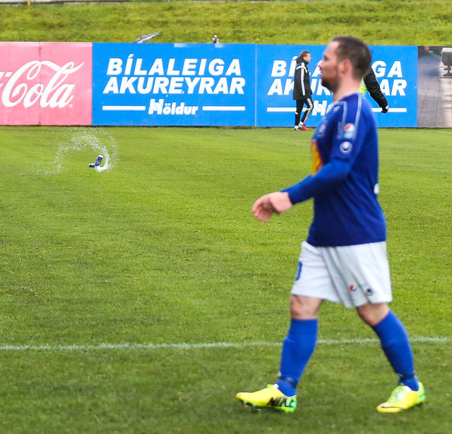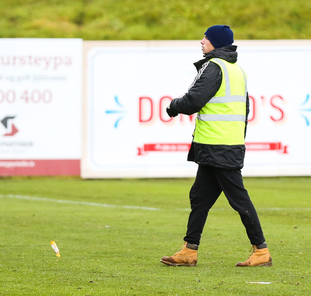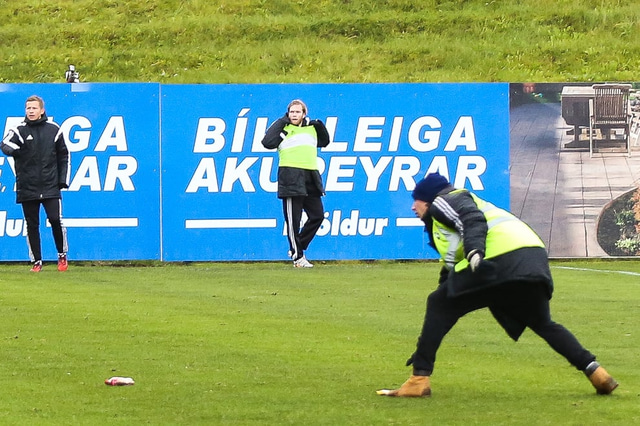 Jón Rúnar Halldórsson formaður knattspyrnudeildar FH kominn inn á völl og bendir Sigurði Óla á aðskotahluti sem Silfurskeiðin henti inn á völlinn. Fleiri myndir af því má sjá neðst í fréttinni.