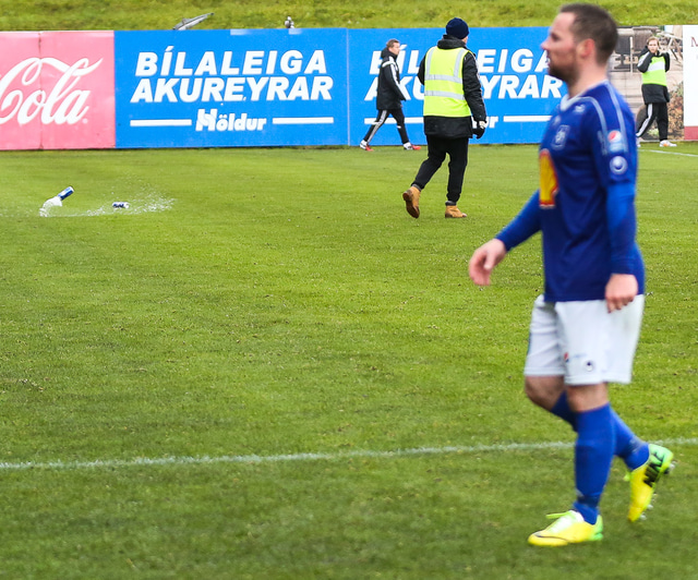 Einn stuðningsmaður FH gekk svo langt að hlaupa inn á völlinn eftir leik en hann braut flaggið hjá aðstoðardómaranum.