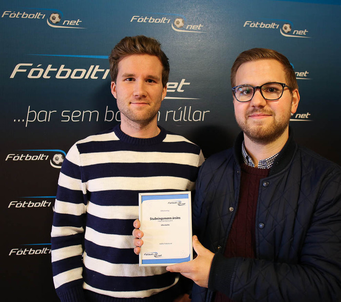 Þriðja árið í röð velur Fótbolti.net stuðningsmannahóp Stjörnunnar, Silfurskeiðina, sem stuðningsmenn ársins. Elías Guðmundsson og Viktor Hrafn Hólmgeirsson úr Silfurskeiðinni mættu í höfuðstöðvar Fótbolta.net í dag og veittu viðurkenningarskjali viðtöku.