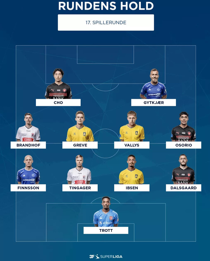 Kolbeinn Finnsson, vinstri bakvörður Lyngby og íslenska landsliðsins, er í úrvalsliði umferðarinnar í dönsku úrvalsdeildinni.