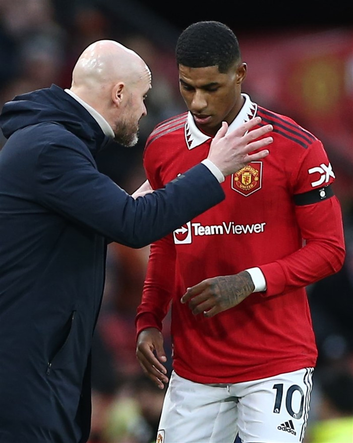 Það gustar um Manchester United, einu sinni sem oftar. Enskir fjölmiðlar segja óeiningu í klefanum og sagt hefur verið að helmingur leikmannahópsins sé ekki á bandi stjórans Erik ten Hag.