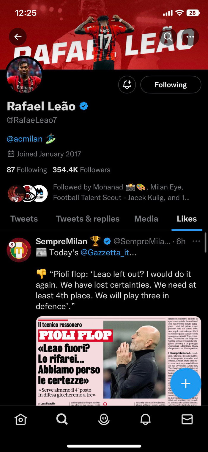 Þetta hefur ekki farið vel í stuðningsmenn Milan og ekki Leao heldur ef Twitter er skoðað. Þar líkar Leao við færslu frá SempreMilan aðganginum, sem er með yfir 100 þúsund fylgjendur.