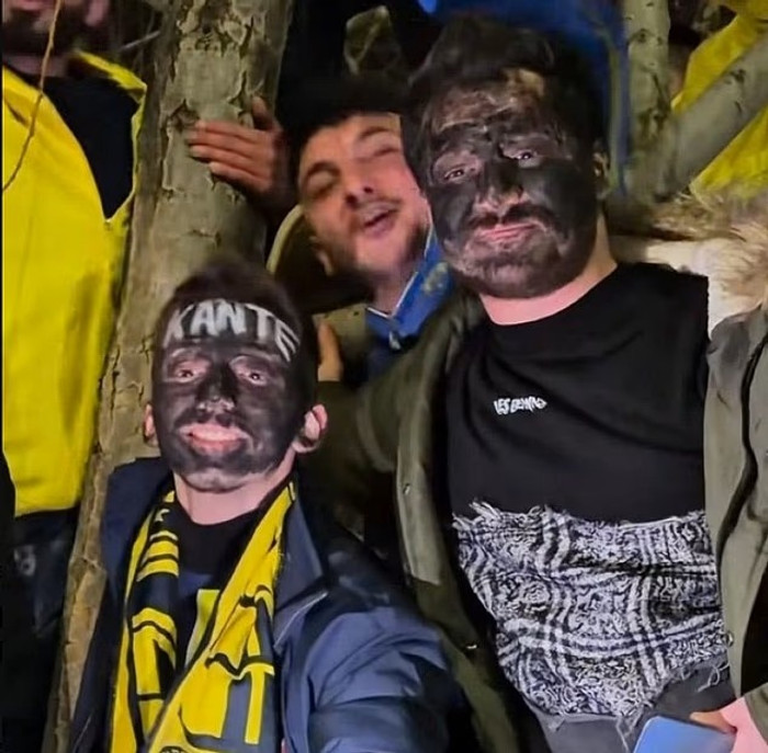 Tveir af þessum stuðningsmönnum tyrkneska liðsins hafa fengið hörð viðbrögð en þeir voru með svokallað 'blackface', málaðir svartir í framan og annar þeirra með nafn Kante skrifað.