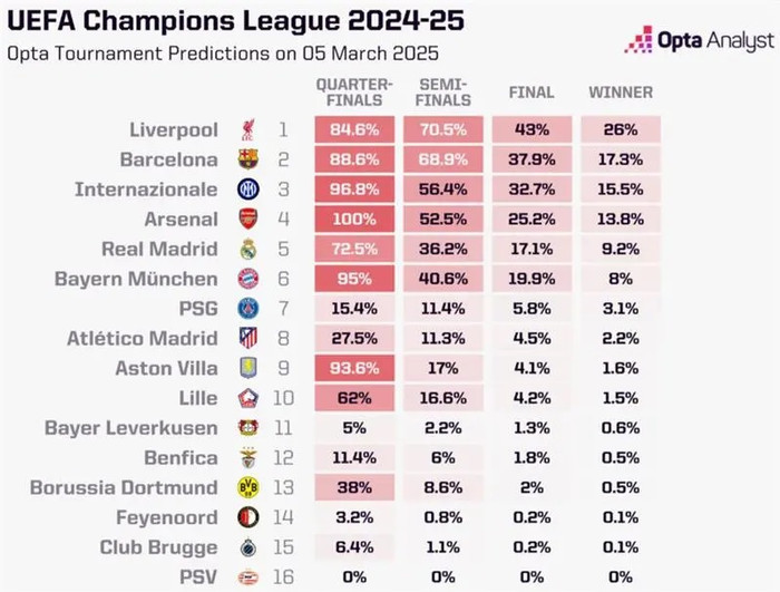 Ofurtölva Opta metur Liverpool enn sigurstranglegast í Meistaradeild Evrópu. Liverpool vann 1-0 útisigur gegn Paris St-Germain í fyrri viðureign liðanna í 16-liða úrslitum.