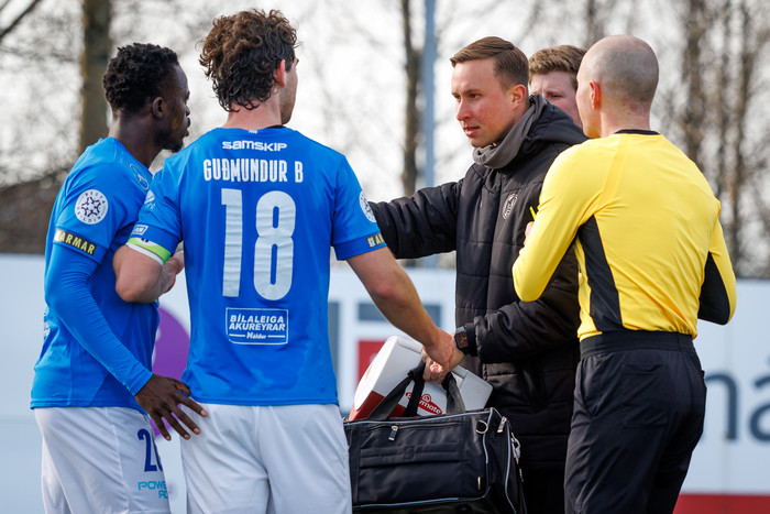 Mönnum var flýtt aftur á völlinn eftir meiðsli og álagið mikið á Guðjóni Erni Ingólfssyni, styrktarþjálfara liðsins.