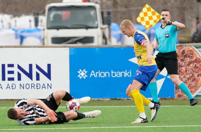 Það var hiti í leikslok þegar KA og KR mættust á Greifavellinum í gær. Orðaskipti urðu milli manna en þegar allt virtist vera farið að róast hljóp Ásgeir Sigurgeirsson, fyrirliði KA, að Aroni Þórði Albertssyni og var hann sýnilega ekki kátur með KR-inginn.