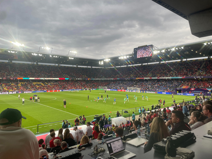 Tugþúsundir Svisslendinga fengu hér að kynnast laginu Keyrum inn í helgina með 12:00 og svo var Blikalagið með Herra Hnetusmjör líka spilað. Það var einnig spilað fyrir fyrsta leikinn gegn Finnlandi en það eru margir Blikar í íslenska liðinu.