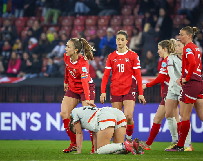 Það var mikill hraði á upphafsmínútunum og var íslenska liðið hættulegra en tókst þó ekki að koma sér í gott færi. Þegar tók að líða á hálfleikinn urðu þær svissnesku betri og komu boltanum í netið, en ekki dæmt mark eftir athugun í VAR-herberginu vegna augljóss brots í aðdragandanum.