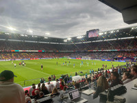 Það er uppselt á leikinn, um 30 þúsund manns á vellinum; þar af eru um 2 þúsund Íslendingar sem láta vel í sér heyra.