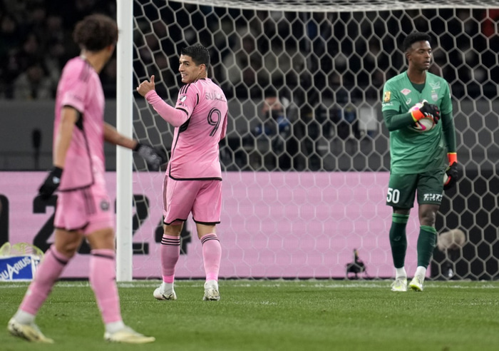 Luis Suarez, framherji Inter Miami í Bandaríkjunum, hefur fengið sex leikja bann fyrir að hrækja á starfsmann Seattle Sounders eftir 3-0 tap í Leagues Cup á dögunum.