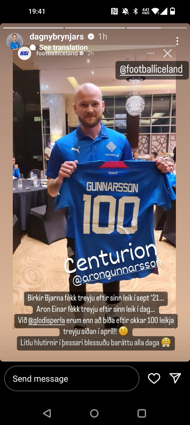 „Við Glódís Perla erum enn að bíða eftir okkar 100 leikja treyju síðan í apríl. Litlu hlutirnir í þessari blessuðu baráttu alla daga," skrifar Dagný en skjáskot af færslu hennar má sjá hér fyrir neðan.