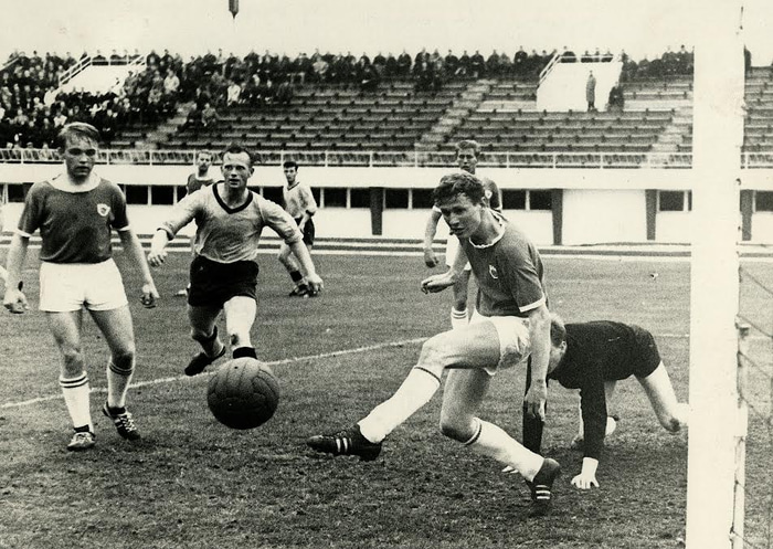 Ríkharður Jónsson í leik með ÍA gegn Fram árið 1965. Björn Lárusson er Skagamaðurinn sem sést fyrir aftan hann