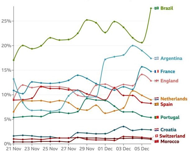 Samkvæmt tölfræðiútreikningum Opta er Brasilía líklegasta liðið til að standa uppi sem sigurvegari á HM. Brassarnir unnu Suður-Kóreu auðveldlega 4-1 í gær.
