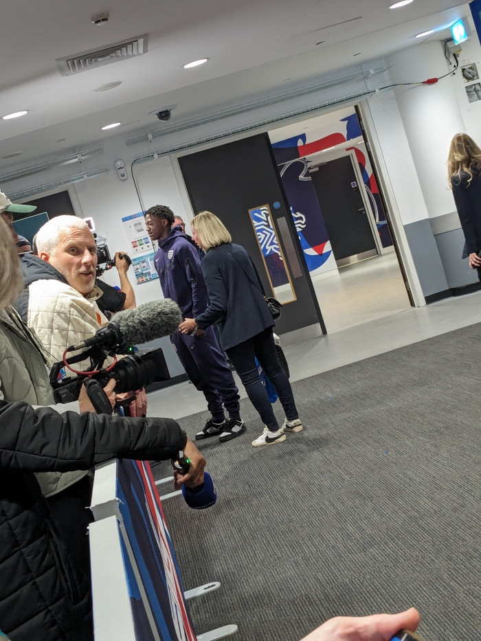 Það vakti athygli að Mainoo hélt á íslenskri landsliðstreyju þegar hann gekk í gegnum fjölmiðlasvæðið. Hann skipti á treyjum við Bjarka Stein Bjarkason, leikmann Venezia.