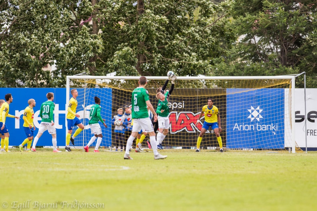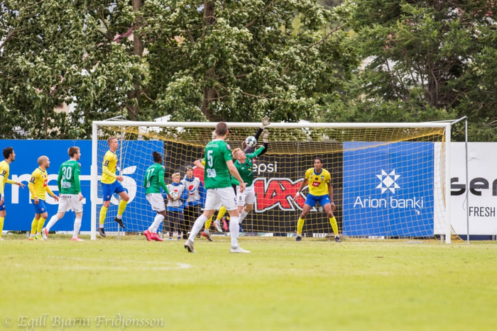 Hér beint fyrir neðan má sjá tvær myndir sem ljósmyndarinn Egill Bjarni Friðjónsson tók af atvikinu og eru myndirnar birtar með góðfúslegu leyfi hans. Þar fyrir neðan má sjá myndir frá Sævari Geir Sigurjónssyni sem tók myndir fyrir Fótbolta.net og var með annað sjónarhorn á atvikið.