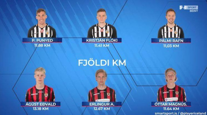 Ágúst Eðdvald hljóp 13,18 kílómetra í leiknum en þar af voru 1456 metrar á hárri ákefð. Ágúst tók 42 spretti í leiknum. Erlingur hljóp 12,67 kílómetra, þar af 1408 metrar á hárri ákefð. Erlingur tók 43 spretti í leiknum.