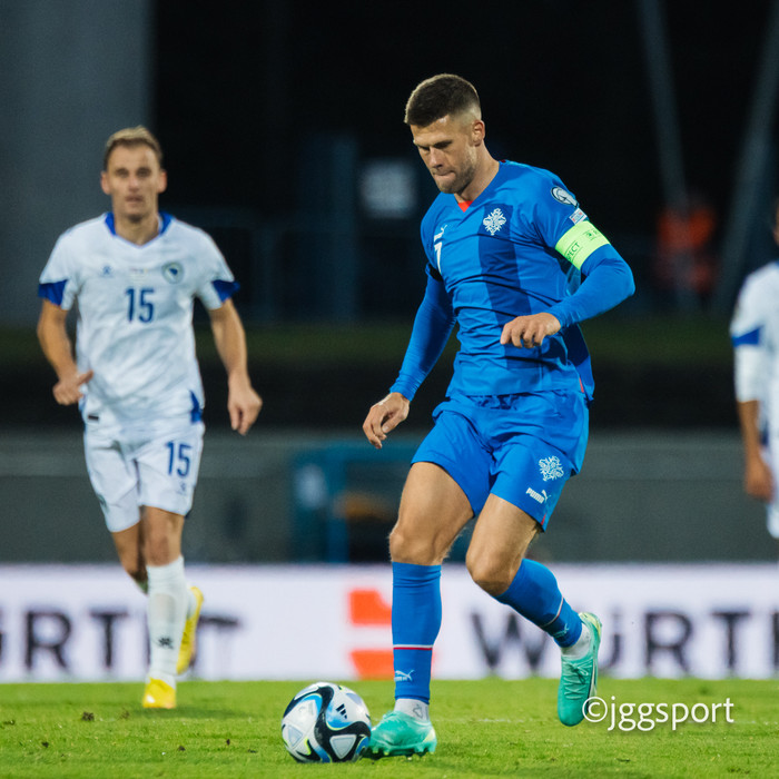 Sést í Nemanja Bilbija, fyrirliða Zrinjski, í bakgrunni á þessari mynd af Jóa Berg á Laugardalsvelli.