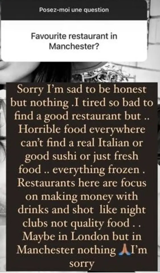 Sara Arfaoui, eiginkona Ilkay Gundogan sem er fyrirliði Manchester City, sagði í færslu á Instagram á dögunum að hún ætti engan uppáhalds veitingastað í borgininni, væri alls ekki hrifin af matnum í Manchester. Hún hefði ekki fundið matsölustað þar sem væri hægt að fá góðan mat.
