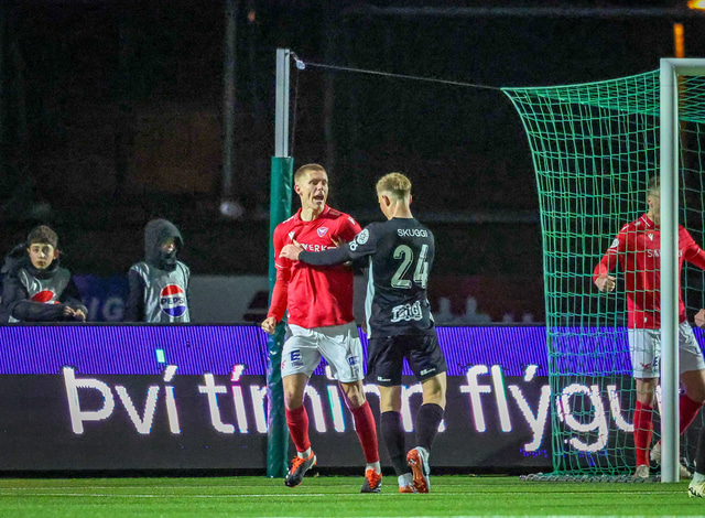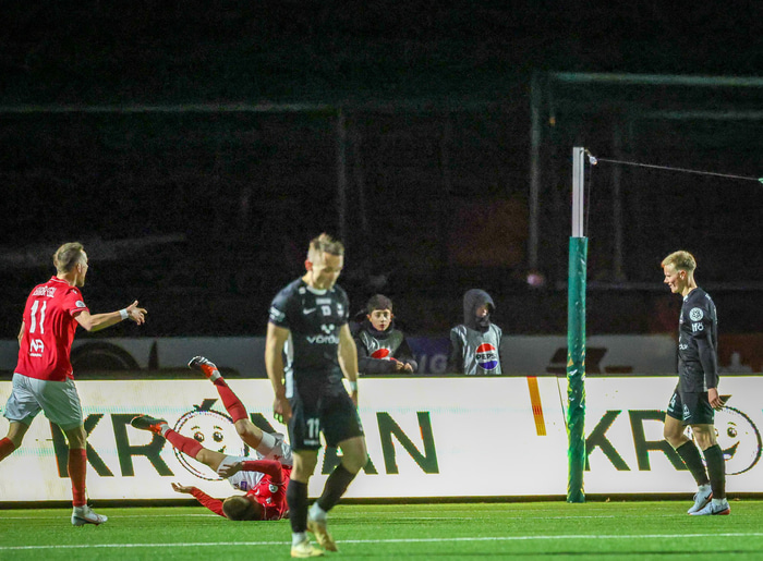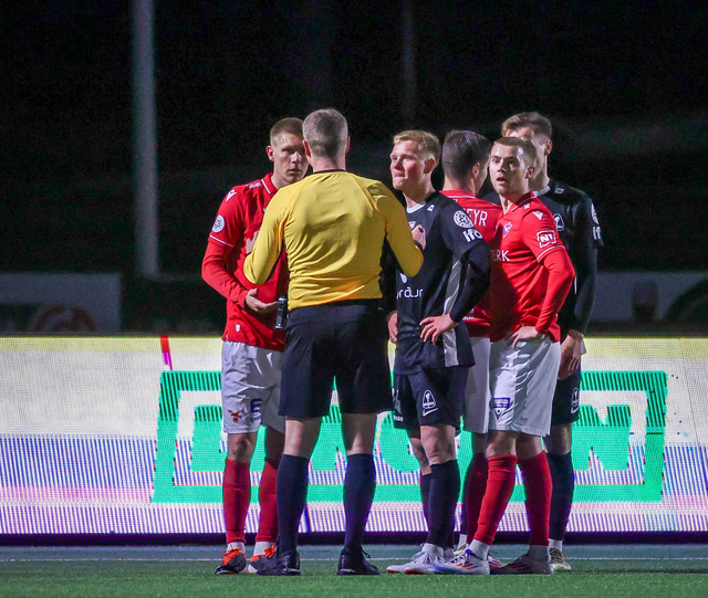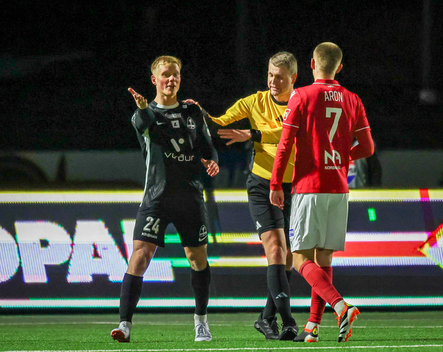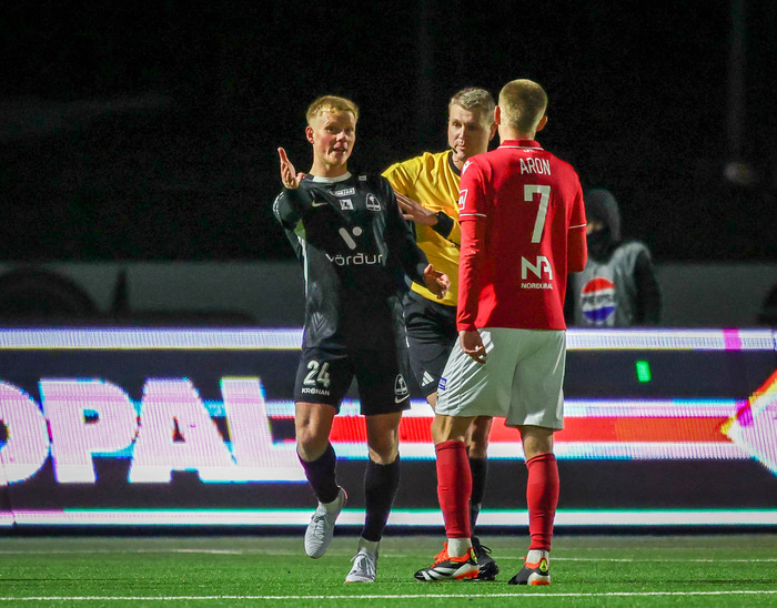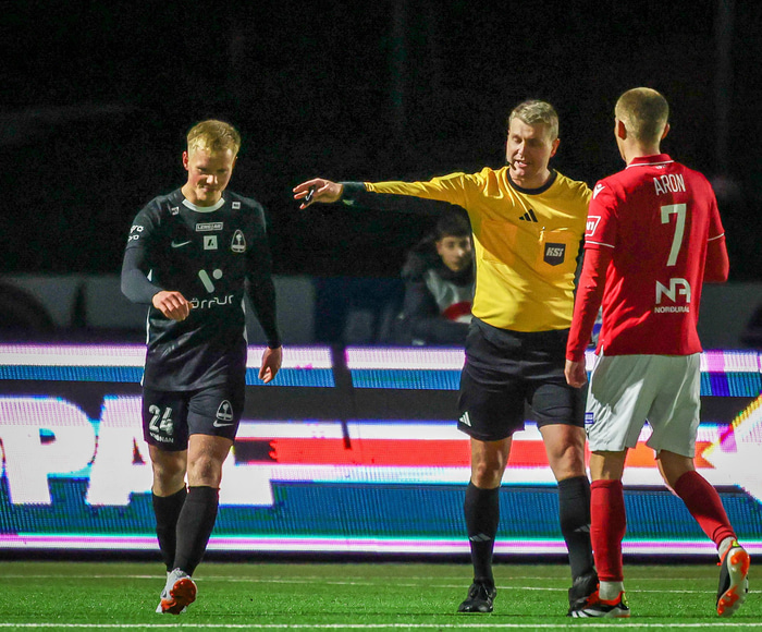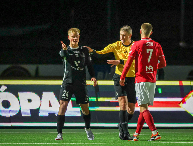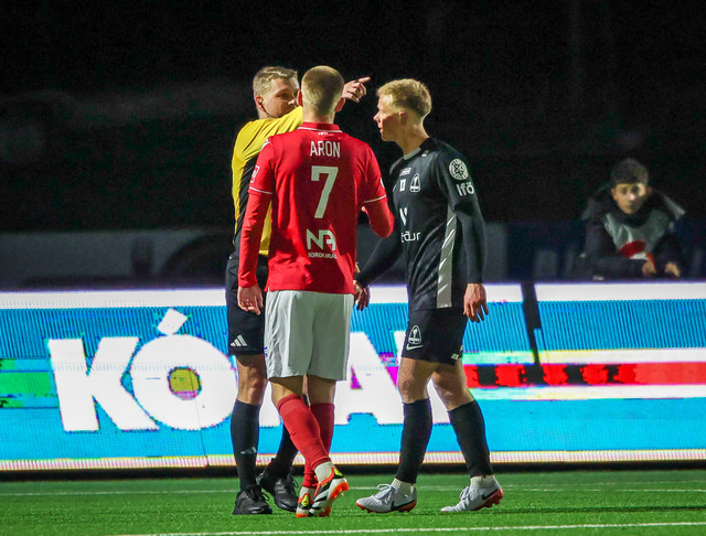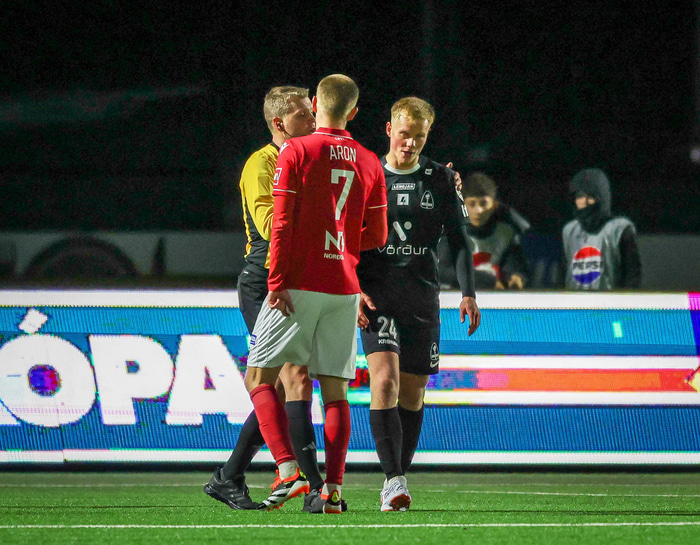 Aron fagnaði í andlitið á Arnóri Gauta sem hrinti Valsmanninum í grasið. Aron flaug með tilþrifum nokkra metra en Elías Ingi Árnason dómari hélt ró sinni, veiti Arnóri Gauta aftur tiltal og þegar hann lét ekki segjast og hélt áfram að atast í Aroni ýtti Elías Ingi honum í burtu eins og meðfylgjandi myndir sýna.