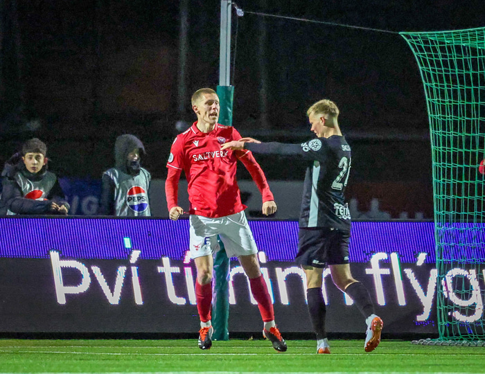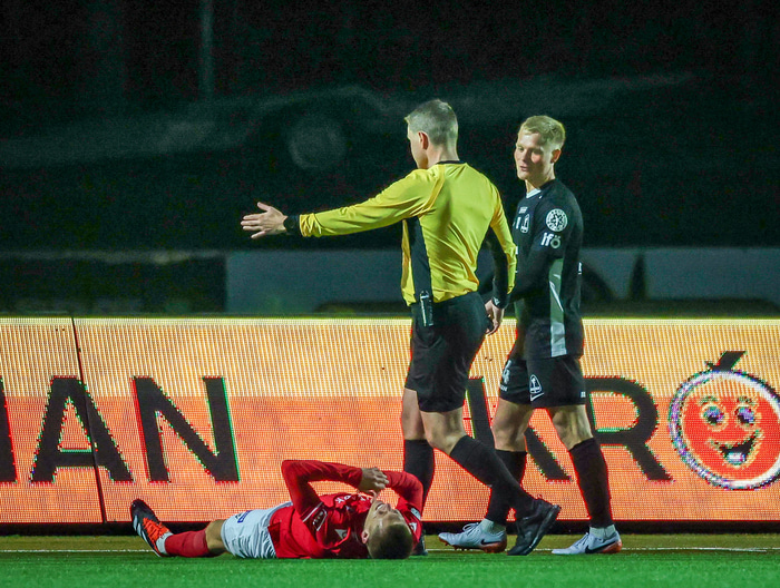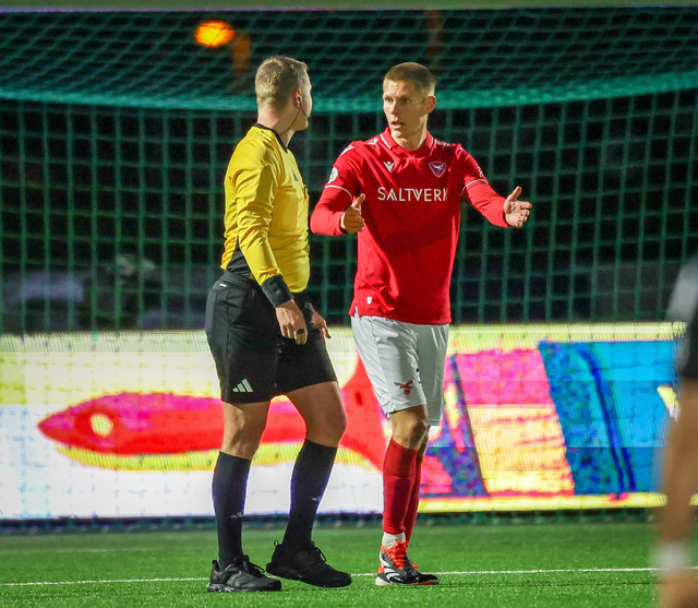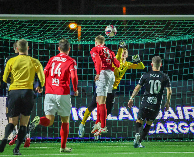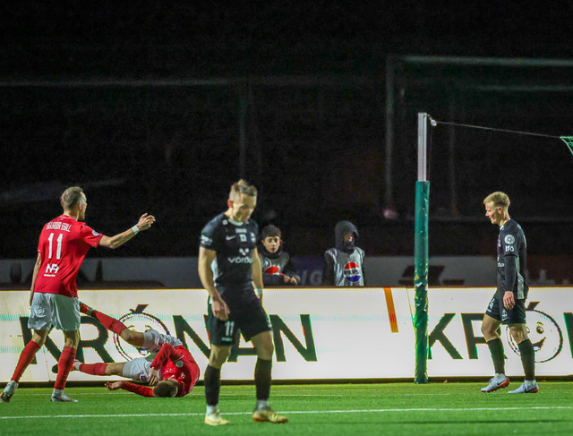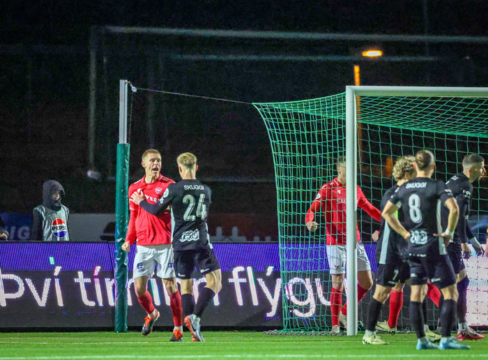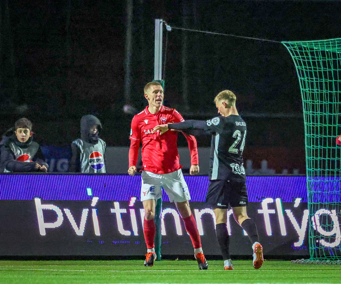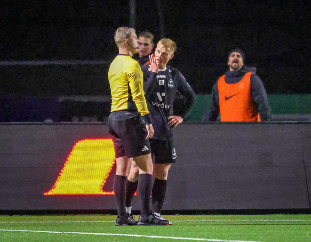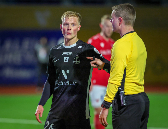 Aron fagnaði í andlitið á Arnóri Gauta sem hrinti Valsmanninum í grasið. Aron flaug með tilþrifum nokkra metra en Elías Ingi Árnason dómari hélt ró sinni, veiti Arnóri Gauta aftur tiltal og þegar hann lét ekki segjast og hélt áfram að atast í Aroni ýtti Elías Ingi honum í burtu eins og meðfylgjandi myndir sýna.