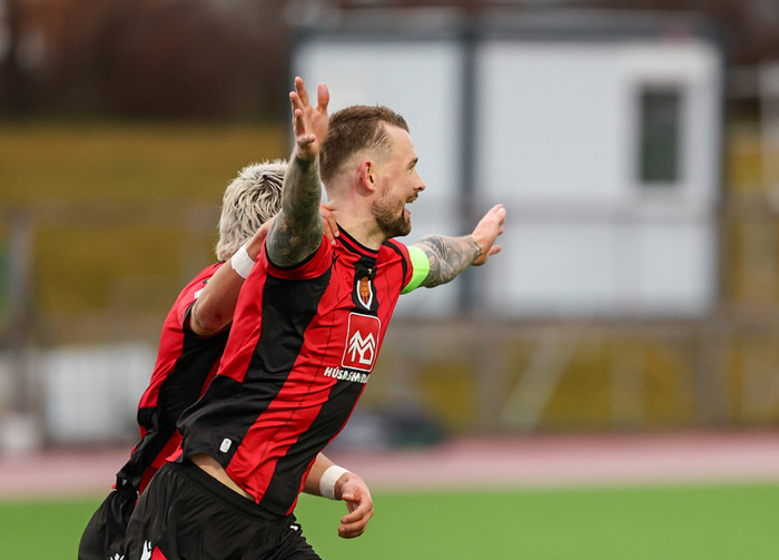 Skömmu síðar tvöfaldaði bakvörðurinn Karl Friðleifur forystuna með marki eftir langt innkast frá hinum bakverðinum, Davíð Erni Atlasyni.