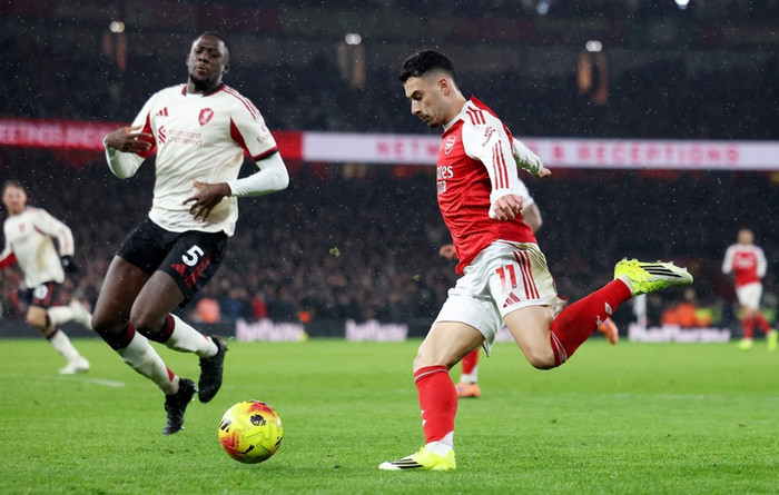Þetta fór ekki vel í leikmenn Liverpool og í kjölfarið sauð upp úr, en Martinelli fékk gult spjald fyrir vikið. Stuttu síðar var Bradley borinn af velli og er óttast að hann verði lengi frá.
