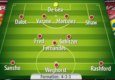Líklegt byrjunarlið Manchester United, fyrir leik gegn Leeds (4-2-3-1): De Gea; Dalot, Varane, Martinez, Shaw; Fred, Sabitzer; Sancho, Fernandes, Rashford; Weghorst.
