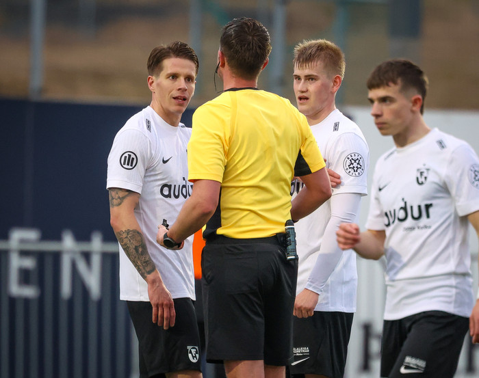 „Þetta er vítaspyrna eða hvað? Nei segir Vilhjálmur Alvar. Tómas Orri fer þarna niður í teignum, Vilhjálmur Alvar vel staðsettur. Tómas kemur á blindu hliðina og þetta er klaufalegt hjá Örvari Loga, mér sýnist hann reka sig aftur í hælinn á Tómasi Orra. Þarna eru Stjörnumenn heppnir að mínu mati, hefði alveg verið hægt að dæma víti," sagði Kristinn Kjærnested sem lýsti leiknum á Stöð 2 Sport í gær.