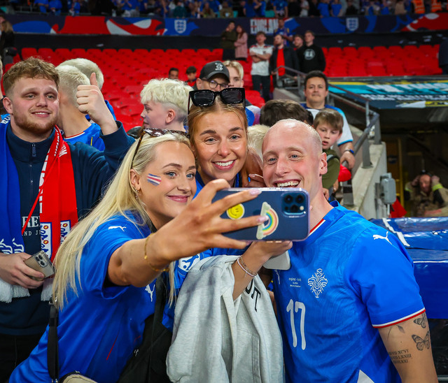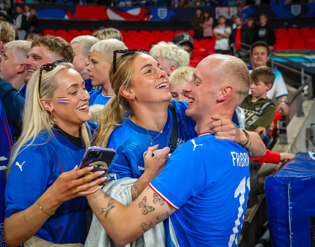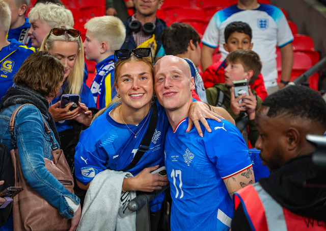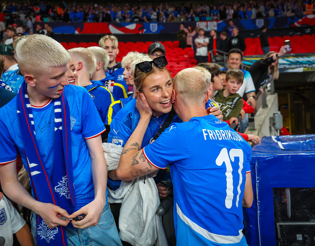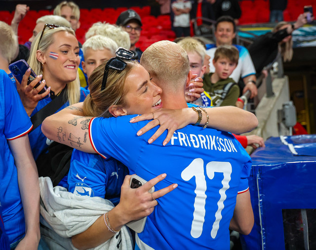 Landsliðsparið Valgeir Lunddal Friðriksson og Diljá Ýr Zomers gátu fagnað saman í gærkvöldi þegar karlalandslið Íslands vann 0 - 1 sigur á því enska á Wembley.
