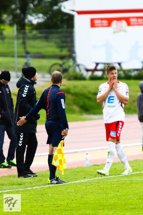 Pétur Guðmundsson, dómari, sýndi Gísla gula spjaldið fyrir að brjóta á Denis Sytnik en myndband af atvikinu má sjá neðst í þessari frétt.